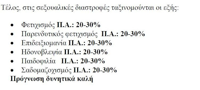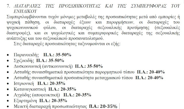 Πάντως, ανεξάρτητα από όσα αναφέρει το υπουργείο, εκ των υστέρων, αφού η απόφαση δημοσιεύτηκε στο ΦΕΚ στις αρχές Νοεμβρίου, όσοι είναι παιδόφιλοι μπορούν να τύχουν ευεργετικών διατάξεων καθώς θεωρούνται άτομα με αναπηρία. Μάλιστα αν καταφέρουν να αποδείξουν ότι είναι και σαδομαζοχιστές, τότε έχουν ακόμη μεγαλύτερο ποσοστό αναπηρίας και μπορούν να πάρουν ακόμη και αναπηρικό επίδομα.