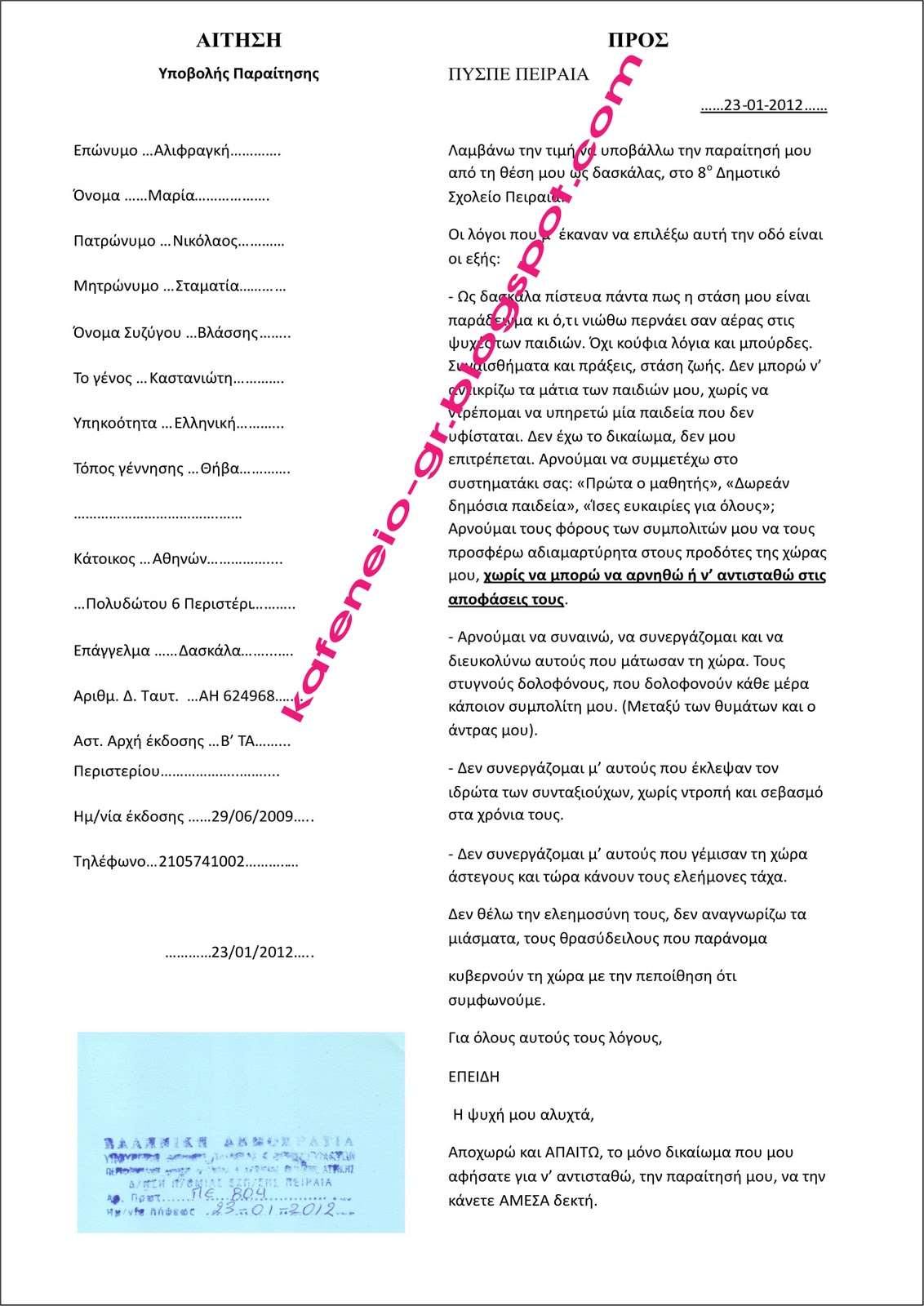 Λαμβάνω την τιμή να υποβάλλω την παραίτησή μου από τη θέση μου ως δασκάλας, στο 8ο Δημοτικό Σχολείο Πειραιά.