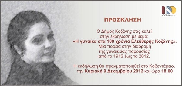 Ο Δήμος Κοζάνης με αφορμή την συμπλήρωση 100 χρόνων από την απελευθέρωση της Κοζάνης και την ενσωμάτωσή της στο εθνικό κορμό, προβάλλει ένα κομμάτι της τοπικής ιστορίας μέσα από την ανάδειξη της θέσης της γυναίκας κατά την περίοδο 1912-2012. Η παρουσίαση αυτή συντελεί στην σκιαγράφηση του κοινωνικού και πολιτιστικού πλαισίου της περιοχής και συμβάλλει στην μεγαλύτερη κατανόηση του πολιτιστικού υπόβαθρου της τοπικής κοινωνίας της Κοζάνης. Ταυτόχρονα αποτελεί, έναν ελάχιστο φόρο τιμής στην συνεισφορά της Κοζανίτισας στην περιοχή όλα αυτά τα χρόνια. Η εκδήλωση θα πραγματοποιηθεί στο Κοβεντάρειο, στις 9 Δεκεμβρίου 2012 και ώρα 18:00.