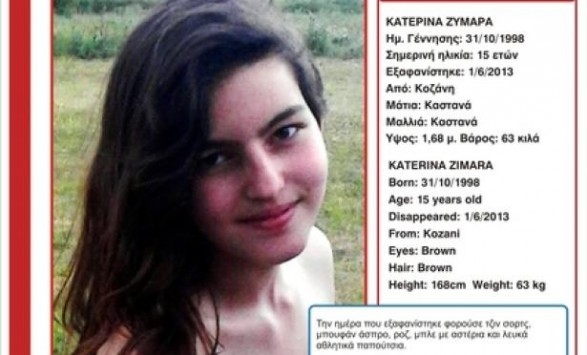 Κοζάνη 14/06/2013 Βρέθηκε η 15χρονη μαθήτρια που είχε εξαφανιστεί από την Κοζάνη 0 Εντοπίστηκε απο αστυνομικούς στην Κοζάνη η μαθήτρια Κατερίνα Ζυμάρα και είναι καλά στην υγεία της. Η 15χρονη αγνοούνταν από το Σάββατο 1 Ιουνίου.