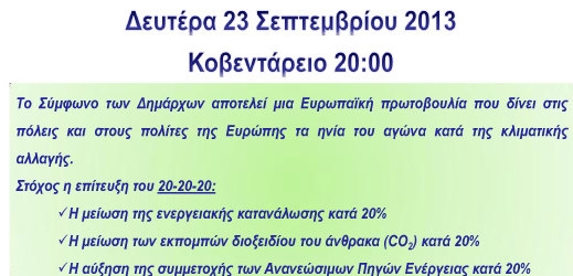 Ο Δήμος Κοζάνης σε συνεργασία με το Πανεπιστήμιο Δυτικής Μακεδονίας, σας προσκαλούν στην παρουσίαση του Σχεδίου δράσης για την Αειφόρο Ενέργεια (ΣΔΑΕ) στο Δήμο Κοζάνης, στα πλαίσια του «Συμφώνου των Δημάρχων», στο Δημοτικό Συμβούλιο που θα πραγματοποιηθεί την Δευτέρα 23 Σεπτεμβρίου 2013, ώρα 20.00, στην αίθουσα «Κοβεντάρειο», στη πόλη της Κοζάνης.