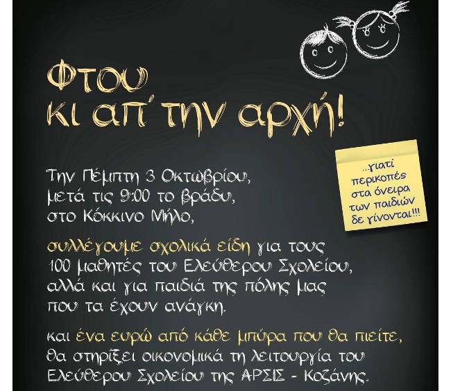 Τα σχολικά είδη που θα συγκεντρωθούν θα διανεμηθούν στους περισσότερους από τους 100 μαθητές του Ελεύθερου Σχολείου μας, αλλά και σε παιδιά της πόλης που τα έχουν ανάγκη.