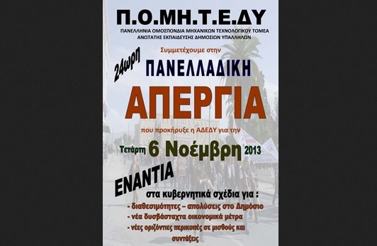 Η Ομοσπονδία μας συμμετέχει στην 24ωρη Πανελλαδική Απεργία που προκήρυξε η ΑΔΕΔΥ για την Τετάρτη 6 Νοεμβρίου 2013.