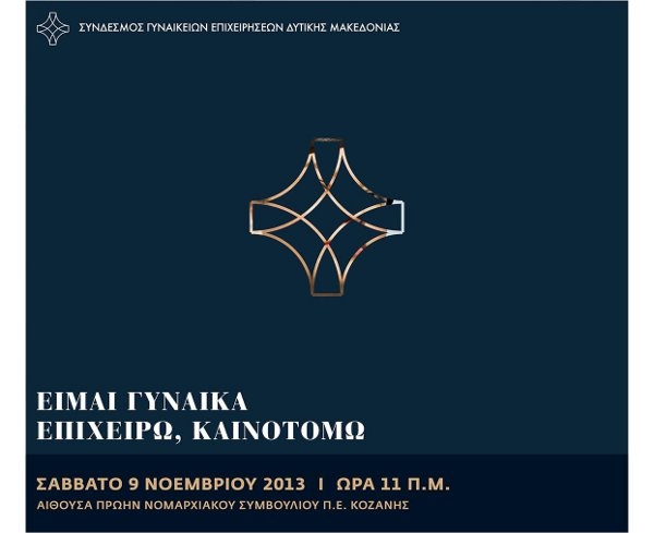 Ο Σύνδεσμος Γυναικείων Επιχειρήσεων Δυτικής Μακεδονίας πραγματοποιεί ημερίδα για την Γυναικεία Επιχειρηματικότητα με τίτλο “Είμαι Γυναίκα – Επιχειρώ, Καινοτομώ” το Σάββατο 9 Νοεμβρίου 2013 και ώρα 11 π.μ. στην αίθουσα του πρώην Νομαρχιακού Συμβουλίου Π.Ε. Κοζάνης.
