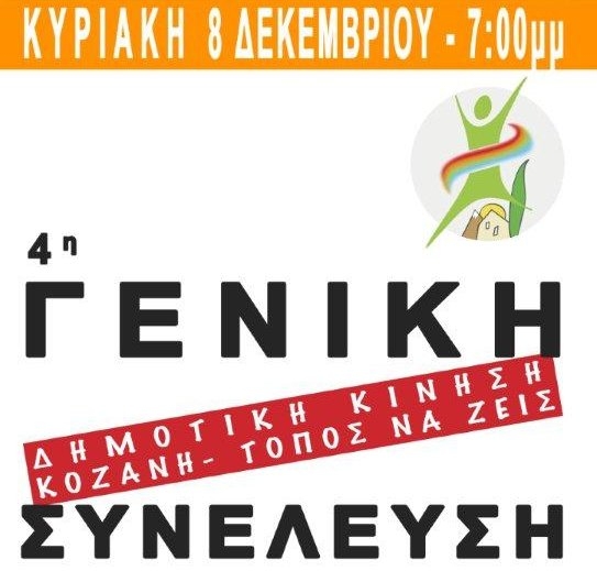 Την Κυριακή 8/12/2013, και ώρα 19:00, στην αίθουσα του πρώην Νομαρχιακού Συμβουλίου στην Κοζάνη, θα πραγματοποιηθεί η Γενική Συνέλευση των μελών της Δημοτικής Κίνησης «Κοζάνη Τόπος να ζεις» στην οποία καλούνται να συμμετάσχουν όλα τα μέλη αλλά και οι φίλοι της Κίνησης με θέματα: