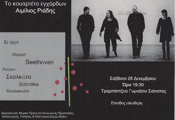 Το Ν.Π.Δ.Δ. Κοινωνικής Προστασίας, Αλληλεγγύης, Παιδείας & Πολιτισμού Δήμου Βοΐου  και το Δημοτικό Ωδείο Σιάτιστας σας εύχεται Καλές Γιορτές και σας προσκαλεί στην συναυλία του κουαρτέτου εγχόρδων «Αιμίλιος Ριάδης» το Σάββατο 28 Δεκεμβρίου και ώρα 7.30 μ.μ στο Τραμπάντζειο Γυμνάσιο Σιάτιστας. Το κουαρτέτο απαρτίζεται από τέσσερα διακεκριμένα στελέχη της Κρατικής Ορχήστρας Θεσσαλονίκης (Ανδρέας Παπανικολάου, Γιώργος Κουγιουμτζόγλου-βιολί, Χαρά Σειρά-βιόλα, Λίλα Μανώλα-τσέλο) και το πρόγραμμα τους περιλαμβάνει έργα των Mozart, Beethoven, Puccini, Schnittke, Shostakovich και Σκαλκώτα. Η είσοδος στη συναυλία μας είναι ελεύθερη για το κοινό.