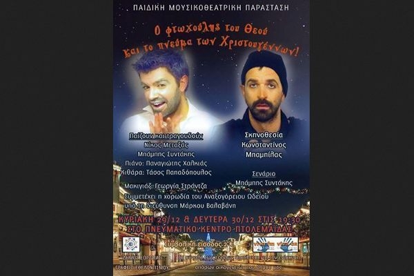 ΤΗΝ ΚΥΡΙΑΚΗ ΚΑΙ ΔΕΥΤΕΡΑ 29-30 ΔΕΚΕΜΒΡΙΟΥ ΚΑΙ ΩΡΑ 19:30 ΣΤΟ ΠΝΕΥΜΑΤΙΚΟ ΚΕΝΤΡΟ, ΣΑΣ ΠΡΟΣΚΑΛΟΥΜΕ ΣΤΗΝ ΠΑΙΔΙΚΗ ΜΟΥΣΙΚΗ ΠΑΡΑΣΤΑΣΗ ΤΟΥ ΝΙΚΟΥ ΜΕΤΑΞΑ-ΜΠΑΜΠΗ ΣΥΝΤΑΚΗ ΣΕ ΣΚΗΝΟΘΕΣΙΑ ΚΩΝΣΤΑΝΤΙΝΟΥ ΜΠΑΜΠΙΛΑ,¨Ο ΦΤΩΧΟΥΛΗΣ ΤΟΥ ΘΕΟΥ ΚΑΙ ΤΟ ΠΝΕΥΜΑ ΤΩΝ ΧΡΙΣΤΟΥΓΕΝΝΩΝ¨, ΜΕ ΣΥΜΒΟΛΙΚΗ ΤΙΜΗ ΕΙΣΟΔΟΥ ΣΤΑ 2 ΕΥΡΩ.
