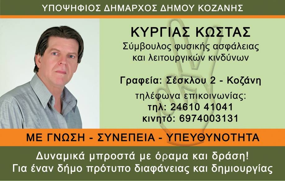 Ο υποψήφιος Δήμαρχος του Δήμου Κοζάνης Κωνσταντίνος Κύργιας και οι συνεργάτες του, σας προσκαλούν να παρευρεθείτε στα εγκαίνια του εκλογικού συνδυασμού «ΑΔΕΣΜΕΥΤΟΙ ΠΟΛΙΤΕΣ», όπου θα τεθούν οι βάσεις του προγράμματος “ Όραμα και Δράση ”, καθώς και η έναρξη του αγώνα.
