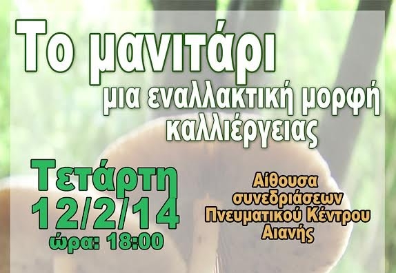 O Δήμος Κοζάνης σας προσκαλεί στην ημερίδα που διοργανώνει, με θέμα: «Το μανιτάρι, μια εναλλακτική μορφή καλλιέργειας», που θα πραγματοποιηθεί την Τετάρτη 12 Φεβρουαρίου 2014, στην αίθουσα συνεδριάσεων του Πνευματικού κέντρου Αιανής, στις 18:00.