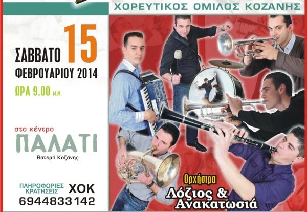 Κοζάνη 11/02/2014 Ο ετήσιος χορός του Χορευτικού Ομίλου Κοζάνης 0 Ο ετήσιος χορός του Χορευτικού Ομίλου Κοζάνης θα πραγματοποιηθεί στις 15 Φεβρουαρίου και ώρα 9 μ.μ. στο Παλλάτι. Ορχήστρα: Λόζιος και Ανακατωσιά. Πληροφορίες στο τηλέφωνο: 6944833142.