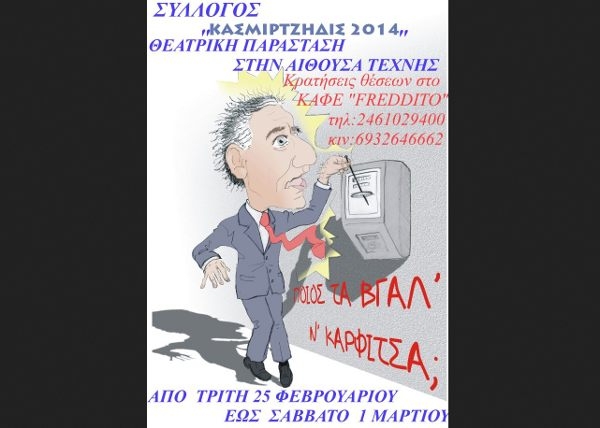 Uncategorized 14/02/2014 Η θεατρική αποκριάτικη παράσταση από τους Κασμιρτζήδις «Ποιος τα βγαλ’ ν’ καρφίτσα» 0 Η θεατρική αποκριάτικη παράσταση από τους Κασμιρτζήδις «Ποιος τα βγαλ’ ν’ καρφίτσα» από την Τρίτη 25 Φεβρουαρίου ως και το Σάββατο 1 Μαρτίου στην Αίθουσα Τέχνης Κοζάνης.