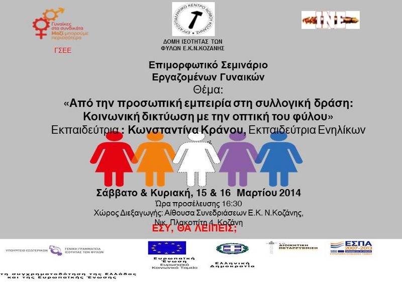 Η Δομή Ισότητας των Φύλων Εργατικού Κέντρου Νομού Κοζάνης και το Ινστιτούτο Εργασίας της Γ.Σ.Ε.Ε. και με ευκαιρία την Παγκόσμια Ημέρα της Γυναίκας, 8 Μαρτίου, σας προσκαλούν σε επιμορφωτικό σεμινάριο που θα υλοποιηθεί με στόχο την επιμόρφωση εργαζόμενων γυναικών στα ζητήματα του συνδικαλισμού και της ισότητας των φύλων, υπό το πρίσμα της παρούσας δυσμενούς οικονομικής συγκυρίας.