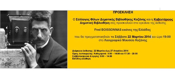 Ο Σύλλογος Φίλων Δημοτικής Βιβλιοθήκης Κοζάνης και η Κοβεντάρειος Βιβλιοθήκη σε συνεργασία με το Ριζάρειο Ίδρυμα, διοργανώνουν έκθεση φωτογραφίας με θέμα: Fred BOISSONNAS εικόνες στην Ελλάδα.