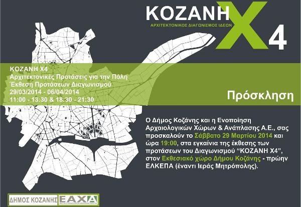 Ο Δήμος Κοζάνης και η Ενοποίηση  Αρχαιολογικών Χώρων & Ανάπλασης Α.Ε., σας προσκαλούν το Σάββατο 29 Μαρτίου 2014 και  ώρα 19:00, στα εγκαίνια της έκθεσης των  προτάσεων του Διαγωνισμού “ΚΟΖΑΝΗ Χ4”,  στον Εκθεσιακό χώρο του Δήμου Κοζάνης – πρώην ΕΛΚΕΠΑ (έναντι Ιεράς Μητρόπολης).