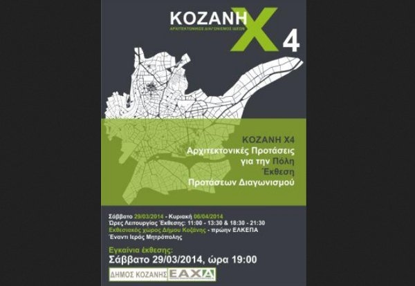 Ο Δήμος Κοζάνης και η Ενοποίηση Αρχαιολογικών Χώρων & Ανάπλασης Α.Ε., σας προσκαλούν το Σάββατο 29 Μαρτίου 2014 και ώρα 19:00, στα εγκαίνια της έκθεσης των προτάσεων του Διαγωνισμού “ΚΟΖΑΝΗ Χ4”, στον Εκθεσιακό χώρο του Δήμου Κοζάνης – πρώην ΕΛΚΕΠΑ (έναντι Ιεράς Μητρόπολης).