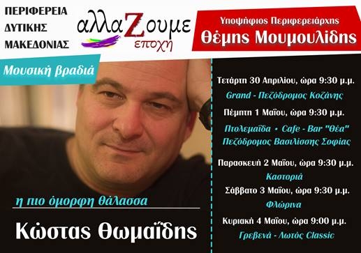 Πέντε λαϊκές συναυλίες με τον Κώστα Θωμαΐδη διοργανώνει ο συνδυασμός «Αλλάζουμε Εποχή» σε ισάριθμες πόλεις της Δυτικής Μακεδονίας.