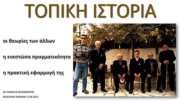 Ανακοίνωση που γράφτηκε για να εκφωνηθεί από στήθους στο πλαίσιο της ημερίδας «Όψεις Τοπικής Ιστορίας» που οργάνωσε ο Σχολικός Σύμβουλος της 5ης Εκπαιδευτικής Περιφέρειας ΠΕ Κοζάνης Ιωάννης Παπαδέλης στην αίθουσα συνεδριάσεων του παλαιού Νομαρχιακού Συμβουλίου Κοζάνης την 17η Ιουνίου 2014
