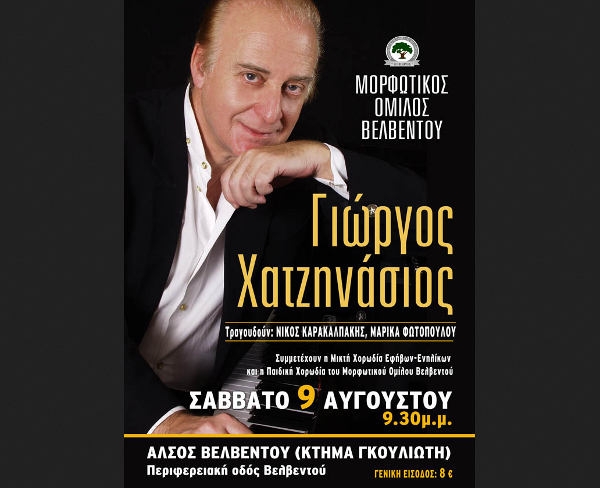 Ο Μορφωτικός Όμιλος Βελβεντού σας προσκαλεί στη μεγάλη συναυλία του φετινού καλοκαιριού με το μουσικοσυνθέτη Γιώργο Χατζηνάσιο.