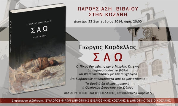 Την Δευτέρα 22 Σεπτεμβρίου, στις 8 μ.μ. ο Σύλλογος Φίλων της Δημοτικής Βιβλιοθήκης Κοζάνης και το Δημοτικό Ωδείο Κοζάνης οργανώνουν την παρουσίαση του μυθιστορήματος του Γιώργου Κορδέλλα «Σαώ» (πρώτη έκδοση: Εκδόσεις Γαβριηλίδης, Μάρτιος 2014).
