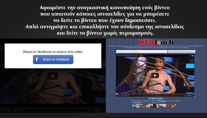 Μοναδική εφαρμογή της εταιρίας Webtouch.gr που αφαιρεί την αναγκαστική κοινοποίηση για να δείτε ένα βίντεο!