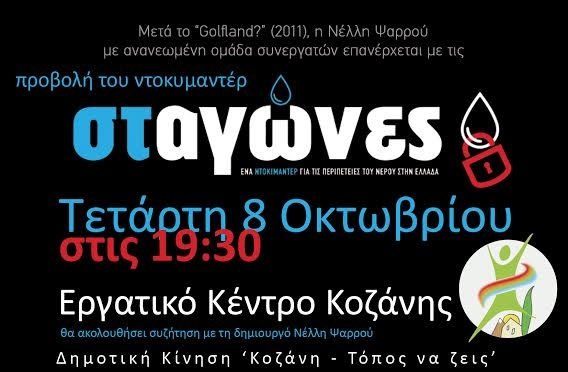 Η Δημοτική Κίνηση “Κοζάνη Τόπος να ζεις” συνεχίζοντας τις παρεμβάσεις της σε σημαντικά θέματα που απασχολούν την Ελληνική κοινωνία προχωρά στην προβολή του ντοκυμαντέρ “ΣΤαγώνες” της Νέλλης Ψαρρού, ενός ντοκυμαντέρ που περιγράφει τις περιπέτειες του νερού στην Ελλάδα.