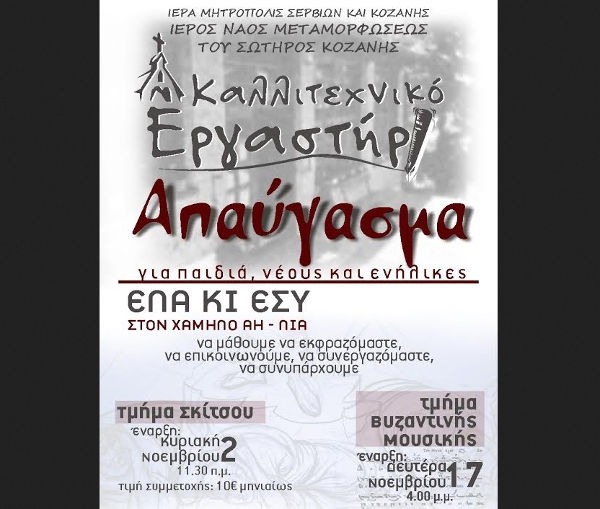 Ανακοινώνεται ότι την Κυριακή 2  Νοεμβρίου και ώρα 11:30 π.μ. στο Πνευματικό Κέντρο του Ιερού Ναού Μεταμορφώσεως του Σωτήρος Κοζάνης ξεκινούν μαθήματα – σεμινάρια σκίτσου.