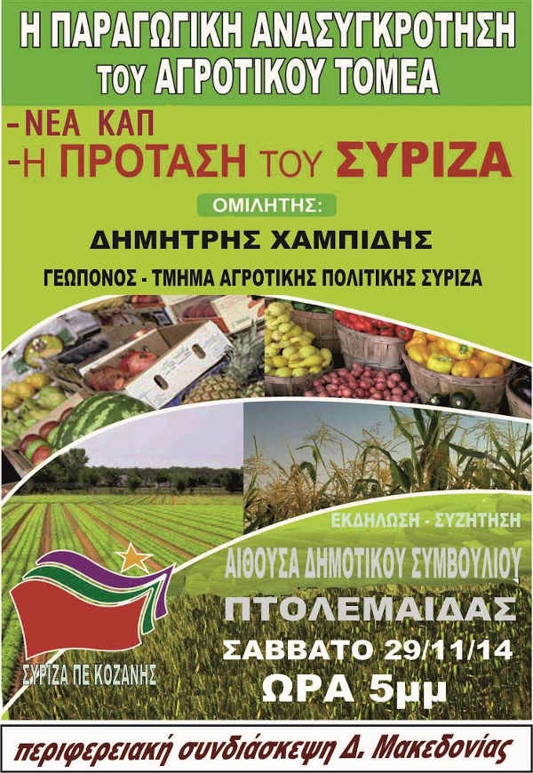 «Νέα Κ.Α.Π., Το Πρόγραμμα του ΣΥΡΙΖΑ για την ΑΓΡΟΤΙΚΗ ΠΟΛΙΤΙΚΗ και η εξειδίκευση του για την Περιφέρεια Δυτικής Μακεδονίας στο πλαίσιο προετοιμασίας της συνδιάσκεψης που θα πραγματοποιηθεί τον Δεκέμβριο στην Κοζάνη με την παρουσία του προέδρου Αλέξη Τσίπρα».