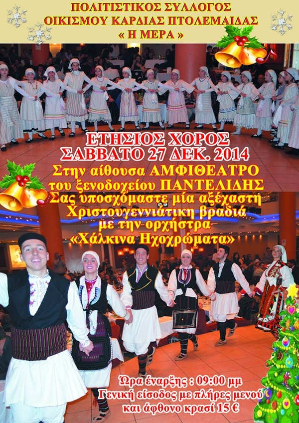 Uncategorized 04/12/2014 Ο ετήσιος χορός του Πολιτιστικού Συλλόγου Καρδιάς «Η ΜΕΡΑ» 0 Ο ετήσιος χορός του Πολιτιστικού Συλλόγου Καρδιάς «Η ΜΕΡΑ» θα πραγματοποιηθεί το Σάββατο 27 Δεκεμβρίου στην αίθουσα Αμφιθέατρο του ξενοδοχείου Παντελίδης στις 21.00.