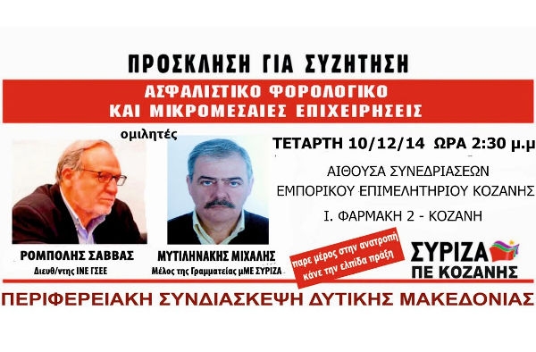 Την Τετάρτη 10/12/14 και ώρα 1 και 30 μ.μ. στην αίθουσα Συνεδριάσεων του Εμπορικού Επιμελητηρίου Κοζάνης (Ι. Φαρμάκη 2) θα δοθεί συνέντευξη τύπου με θέμα «ΑΣΦΑΛΙΣΤΙΚΟ- ΦΟΡΟΛΟΓΙΚΟ ΚΑΙ ΜΙΚΡΟΜΕΣΑΙΕΣ ΕΠΙΧΕΙΡΗΣΕΙΣ» από τους:
