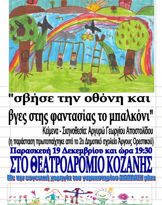 Ο Σύλλογος προσκαλεί και φιλοξενεί το θεατρικό εργαστήρι Άργους Ορεστικού, ανεβάζοντας την παράσταση «σβήσε την οθόνη και βγες στης φαντασίας το μπαλκόνι» στο Θεατροδρόμιο Κοζάνης την Παρασκευή 19-12-2014 και ώρα 19:30μμ.