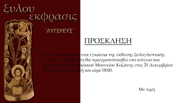 Σας προσκαλούμε στα εγκαίνια της έκθεσης ξυλογλυπτικής τέχνης. Η εκδήλωση θα πραγματοποιηθεί στο ισόγειο του Ιστορικού – Λαογραφικού Μουσείου Κοζάνης στις 21 Δεκεμβρίου 2014, ημέρα Κυριακή και ώρα 18:00.