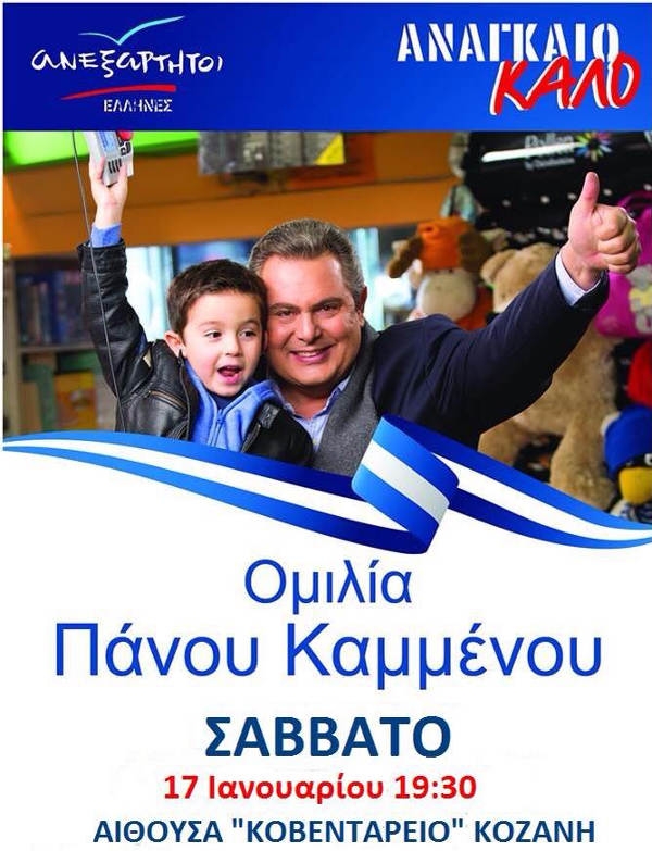 Στην πόλη της Κοζάνης θα παρευρεθεί ο Πρόεδρος των Ανεξάρτητων Ελλήνων, Πάνος Καμμένος, το Σάββατο 17 Ιανουαρίου 2015, στα πλαίσια της προεκλογικής εκστρατείας του κόμματος.