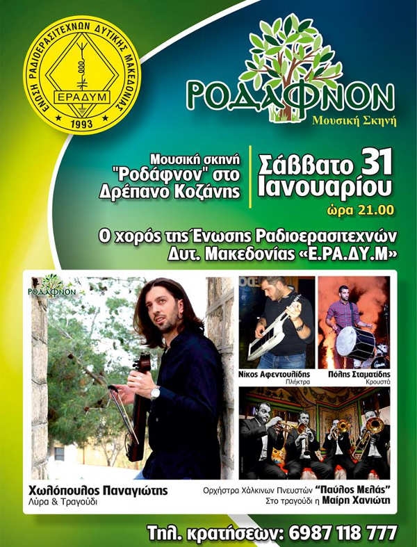 Η διοίκηση της Ένωσης Ραδιοερασιτεχνών Δυτικής Μακεδονίας καλεί τα μέλη και τους φίλους της στην καθιερωμένη ετήσια κοπή της Βασιλόπιτας η οποία θα γίνει το Σάββατο 31/01/2015 και ώρα 21.00, στη Μουσική Σκηνή ΡΟΔΑΦΝΟΝ, στο Δρέπανο Κοζάνης.