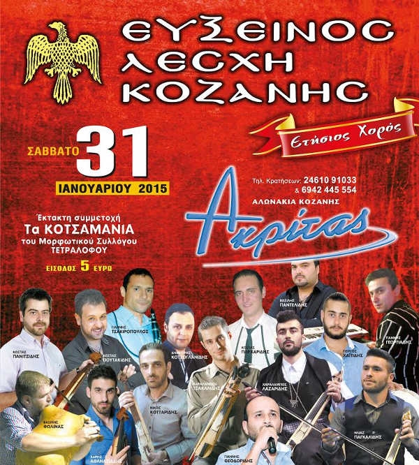 Σας προσκαλούμε στον Ετήσιο Χορό μας, ο οποίος θα λάβει χώρα το Σάββατο 31 Ιανουαρίου 2015 και ώρα 22.00 στο Κέντρο Διασκέδασης «ΑΚΡΙΤΑΣ» στα Αλωνάκια, με πλούσιο καλλιτεχνικό πρόγραμμα.