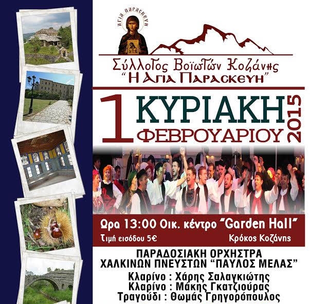 Ο Σύλλογος Βοϊωτών Κοζάνης «Η Αγία Παρασκευή» σας προσκαλεί στον Ετήσιο Χορό του Συλλόγου, την Κυριακή 1 Φεβρουαρίου 2015 και ώρα 13:00 (μεσημέρι), στο οικ. Κέντρο «GARDEN HALL» στον Κρόκο Κοζάνης.