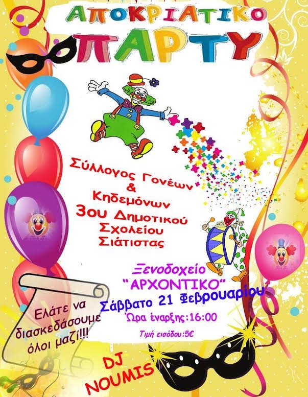 Ο Σύλλογος Γονέων και Κηδεμόνων του 3ου Δημοτικού σχολείου Σιάτιστας σας προσκαλεί στον αποκριάτικο χορό που διοργανώνει το Σάββατο 21 Φεβρουαρίου 2015 και ώρα 4:00μ.μ. στο ξενοδοχείο ΑΡΧΟΝΤΙΚΟ στη Σιάτιστα.