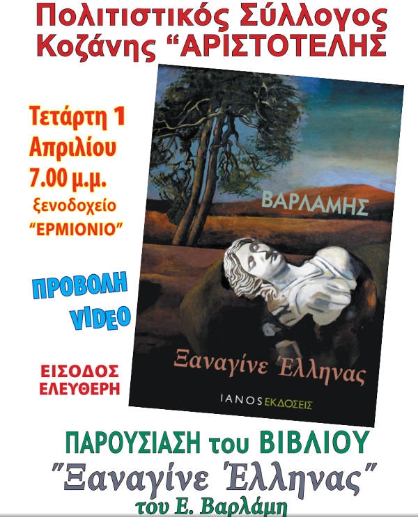 Ο Πολιτιστικός Σύλλογος Κοζάνης «Αριστοτέλης» και το Πειραματικό Εργαστήρι Βεργίνας θα παρουσιάσουν την 1η Απριλίου 2015, στις 7:00 μ.μ. στην αίθουσα του ξενοδοχείου «Ερμιόνιο», ένα όμορφο κι ενδιαφέρον βιβλίο του διεθνούς φήμης συμπατριώτη μας δημιουργού, Καθηγητή Ευθύμιου Βαρλάμη με τίτλο «Ξαναγίνε Έλληνας».