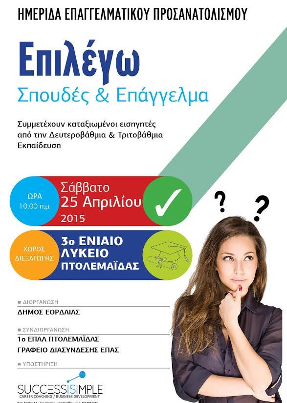 Ο Δήμος Εορδαίας στα πλαίσια των δράσεων ενημέρωσης και ευαισθητοποίησης μαθητών και γονέων πραγματοποιεί ημερίδα με θέμα: «Επιλέγω σπουδές και επάγγελμα» στις 25 Απριλίου 2015 και ώρα 10.00 πμ στην Αίθουσα Εκδηλώσεων του 3ου Ενιαίου Λυκείου με συνδιοργανωτές το 1ο ΕΠΑΛ ΠΤΟΛΕΜΑΪΔΑΣ, το Γραφείο Διασύνδεσης ΕΠΑΣ και την υποστήριξη του Κέντρου Ανάπτυξης Επαγγελματικού Προσανατολισμού και Καριέρας Success Is Simple.