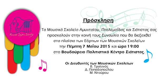 Στο γεωγραφικό διαμέρισμα της Δυτικής Μακεδονίας θα διεξαχθούν στο Βουδούρειο Πολιτιστικό Κέντρο της Σιάτιστας την Πέμπτη 7 Μαΐου 2015 και ώρα 19.00 με την συμμετοχή επιλεγμένων Μουσικών Συνόλων των Μουσικών Σχολείων Αμυνταίου, Πτολεμαΐδας και Σιάτιστας τα οποία θα μας ταξιδέψουν στις μουσικές του κόσμου ερμηνεύοντας ποικίλο ρεπερτόριο και αφήνοντας το δικό τους ξεχωριστό στίγμα στο στερέωμα του μουσικού πενταγράμμου. Στην καρδιά της Άνοιξης με ιδιαίτερο κέφι και μεράκι τα Μουσικά Σχολεία της Δυτικής Μακεδονίας προσκαλούν το φιλόμουσο κοινό να τιμήσει με την παρουσία του αυτή την μοναδική συναυλία όπου η κοινή προσπάθεια μαθητών-καθηγητών και γονέων με τις φτερούγες της υψηλής Μουσικής Τέχνης θα απογειωθεί για να δώσει ένα μοναδικό μήνυμα συνύπαρξης, συνδημιουργίας και αλληλεγγύης.