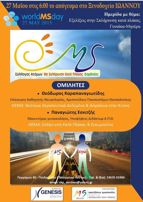 Παρασκευή 22 Μαΐου 2015. Με αφορμή την Παγκόσμια Ημέρα Σκλήρυνσης κατά Πλάκας, ο Σύλλογος Ατόμων Με Σκλήρυνση Κατά Πλάκας Εορδαίας πραγματοποιεί, την Τετάρτη 27 Μαΐου, Ημερίδα Ενημέρωσης και Ευαισθητοποίησης του κοινού με θέμα «Εξελίξεις στην Σκλήρυνση κατά Πλάκας. Γυναίκα – Μητέρα». Η Ημερίδα πραγματοποιείται στην Πτολεμαΐδα στο Ξενοδοχείο Ioannou Resort (3o χλμ. Πτολεμαΐδας – Φλώρινας) με ώρα προσέλευσης 18:00 και η είσοδος είναι ελεύθερη για το κοινό.