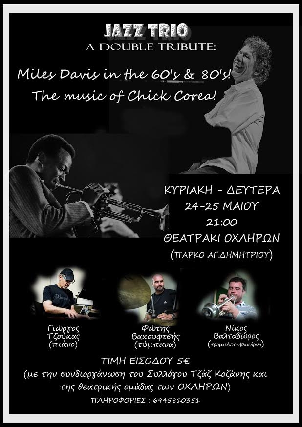 Το JAZ TRIO με συνδιοργανωτές τον Σύλλογο Φίλων Jazz Κοζάνης και την Θεατρική Ομάδα “ΟΧΛΗΡΟΙ”, παρουσιάζουν ένα αφιέρωμα στον MILES DAVIS (The music of Chick Corea).