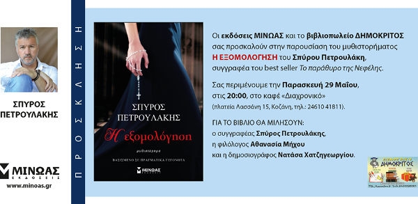 Παρασκευή 29 Μαΐου στις 20:00, οι εκδόσεις ΜιΝΩΑΣ και το βιβλιοπωλείο ΔΗΜΟΚΡΙΤΟΣ σας προσκαλούν στην παρουσίαση του μυθιστορήματος “Η ΕΞΟΜΟΛΌΓΗΣΗ” του Σπύρου Πετρουλάκη, συγγραφέα του best seller “Το παράθυρο της Νεφέλης”.