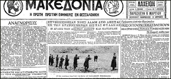 Αυτούσιο το μακροσκελές πρωτοσέλιδο άρθρο της εφημερίδας ΜΑΚΕΔΟΝΙΑ, της 6ης Μαρτίου 1931, έχει ως παρακάτω (γραφή εποχής):