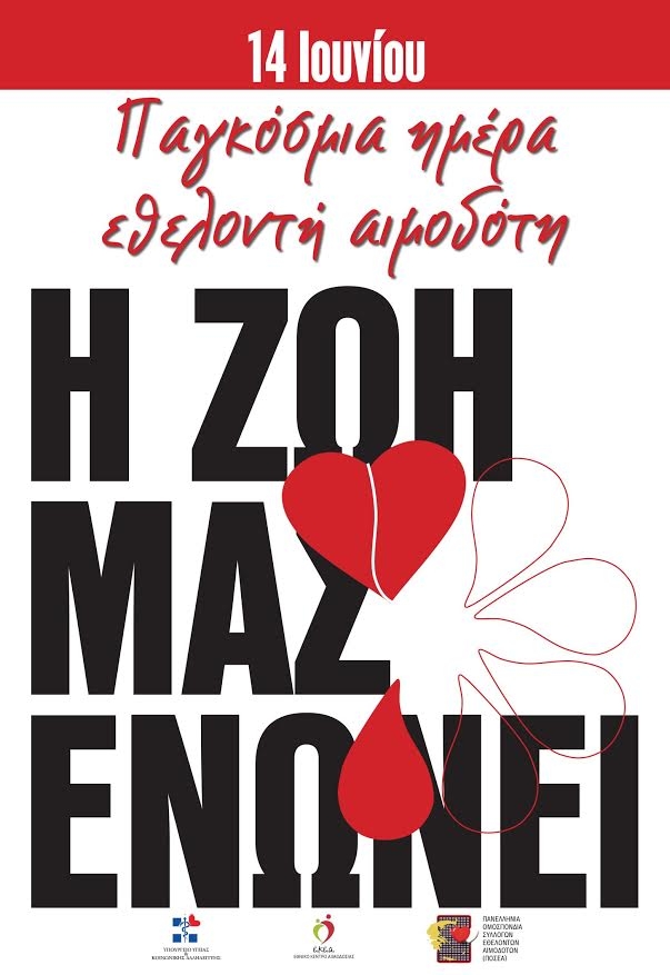 Στις 14 Ιουνίου, σε όλο τον κόσμο και στην Ελλάδα, γιορτάζουμε την Παγκόσμια Ημέρα Εθελοντή Αιμοδότη με διάφορες εκδηλώσεις, για να ευαισθητοποιήσουμε την κοινή γνώμη σχετικά με την ανάγκη για ασφαλές αίμα και τα παράγωγά του, αλλά και για να ευχαριστήσουμε και να τιμήσουμε τους Τακτικούς Εθελοντές μη αμειβόμενους Αιμοδότες για το δώρο ζωής που προσφέρουν με το Αίμα τους.