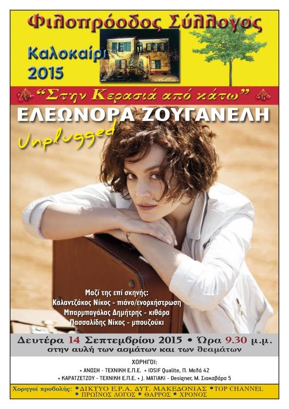 Ο Φιλοπρόοδος Σύλλογος  ρίχνει αυλαία στις καλοκαιρινές μουσικές του εκδηλώσεις και σας προσκαλεί σε μια ανεπανάληπτη μουσική παράσταση με την αγαπημένη όλων, Ελεωνόρα Ζουγανέλη, στην κορυφαία στιγμή της μέχρι τώρα θριαμβευτικής της πορείας, τη Δευτέρα 14 Σεπτεμβρίου 2015.