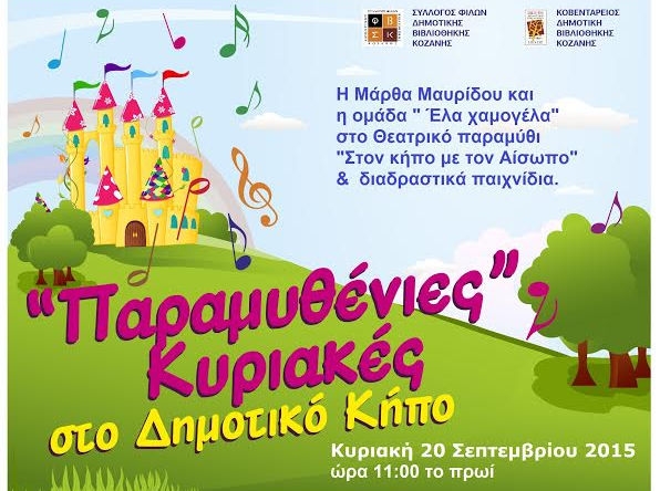 Τελευταία Κυριακή για τις «Παραμυθένιες Κυριακές» στο δημοτικό κήπο Κοζάνης, παρέα με τη Μάρθα Μαυρίδου και τη θεατρική ομάδα «Έλα χαμογέλα» στο θεατρικό παραμύθι «Στον κήπο με τον Αίσωπο» και διαδραστικά παιχνίδια.