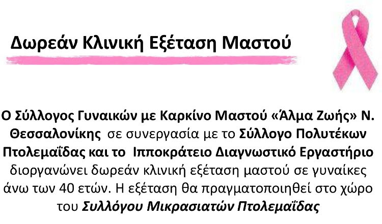Ο Σύλλογος Γυναικών με Καρκίνο Μαστού «Άλμα Ζωής» Ν. Θεσσαλονίκης σε συνεργασία με το Σύλλογο Πολυτέκων Πτολεμαΐδας και το Ιπποκράτειο Διαγνωστικό Εργαστήριο διοργανώνει δωρεάν κλινική εξέταση μαστού σε γυναίκες άνω των 40 ετών. Η εξέταση θα πραγματοποιηθεί στο χώρο του Συλλόγου Μικρασιατών Πτολεμαΐδας.