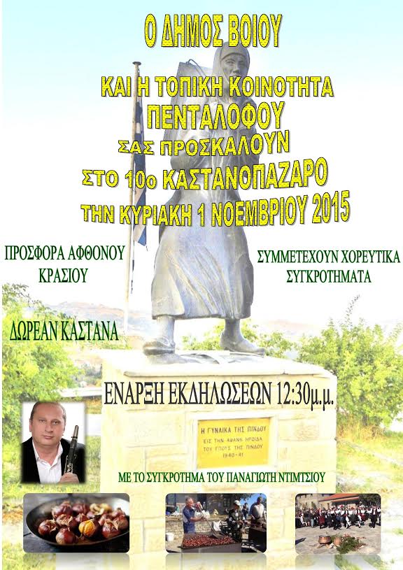Ο Δήμος Βοΐου και η Τοπική Κοινότητα Πενταλόφου σας προσκαλούν στο 10ο Καστανοπάζαρο την Κυριακή 1 Νοεμβρίου 2015 στον Πεντάλοφο του Δήμου Βοΐου.