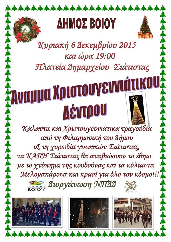 Ο Δήμος Βοΐου και το Ν.Π.Δ.Δ σας προσκαλούν στο άναμμα του χριστουγεννιάτικου δέντρου την Κυριακή 6 Δεκεμβρίου 2015 και ώρα 7.00 μ.μ.. στην πλατεία του Δημαρχείου στη Σιάτιστα.
