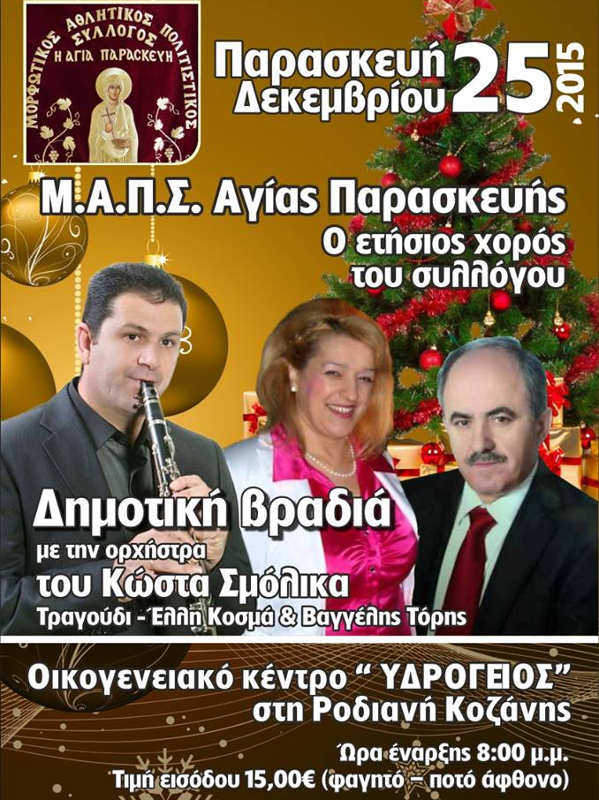 1216365_408823199325083_4138114663820415095_nΤην Παρασκευή 25 Δεκεμβρίου 2015 θα πραγματοποιηθεί ο ετήσιος χορός του Μορφωτικού Αθλητικού Πολιτιστικού Συλλόγου Αγίας Παρασκευής Κοζάνης.